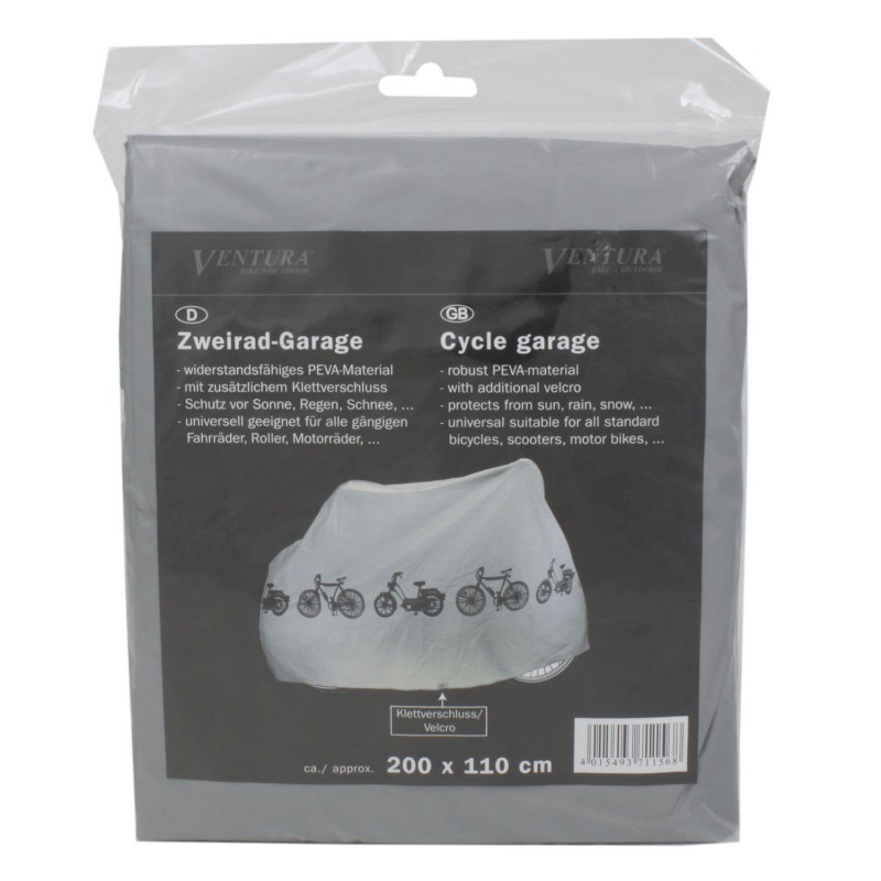 VENTURA bicycle garage это универсальный чехол, который отлично подойдет для различных велосипедов, скутеров, а также для мотоциклов. Чехол для хранения велосипеда VENTURA bicycle garage изготовлен из прочного PEVA материала, имеет длину 2000 мм, высоту 1100 мм и обеспечивает превосходную защиту от солнца, дождя и снега.