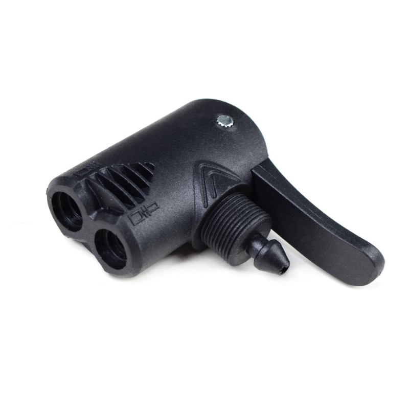 Универсальная двойная головка для напольных насосов, совместима с вентилями AV/FV, имеет удобный рычажок для надежной фиксации головки на ниппеле.