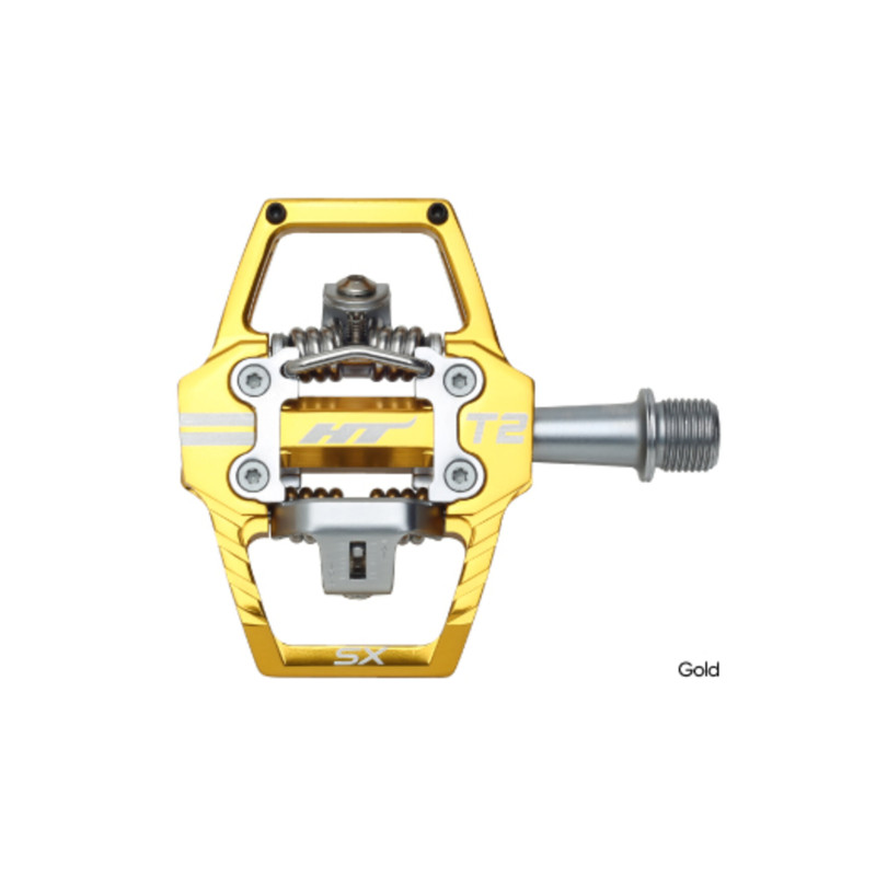 T2SX от именитого производителя профессиональных компонентов HT - пожалуй лучшее эффективное решение из контактных педалей для дисциплин трейл, эндуро и АМ. Платформа педалей HT T2SX выполнена из легкого алюминиевого сплава, двусторонняя система зацепов из прочного Cr-Mo сплава. Рамка позволяет снизить нагрузку на стопу при жестких приземлениях и постоянном педалировании, а также осуществляет дополнительную защиту замка. Фиксируется корпус через герметичные промышленные подшипники и втулку скольжения igus, на Cr-Mo ось, которые также в совокупности долго и беспроблемно служат в любых условиях. Система фиксации имеет регулировку усилия встегивания и выстегивания. Совместимы с фирменными шипами стандарта HT exclusive system - X1E / X1 / X1F. Обратите внимание, педали HT T2SX и система крепления несовместимы со стандартом SPD от Shimano.