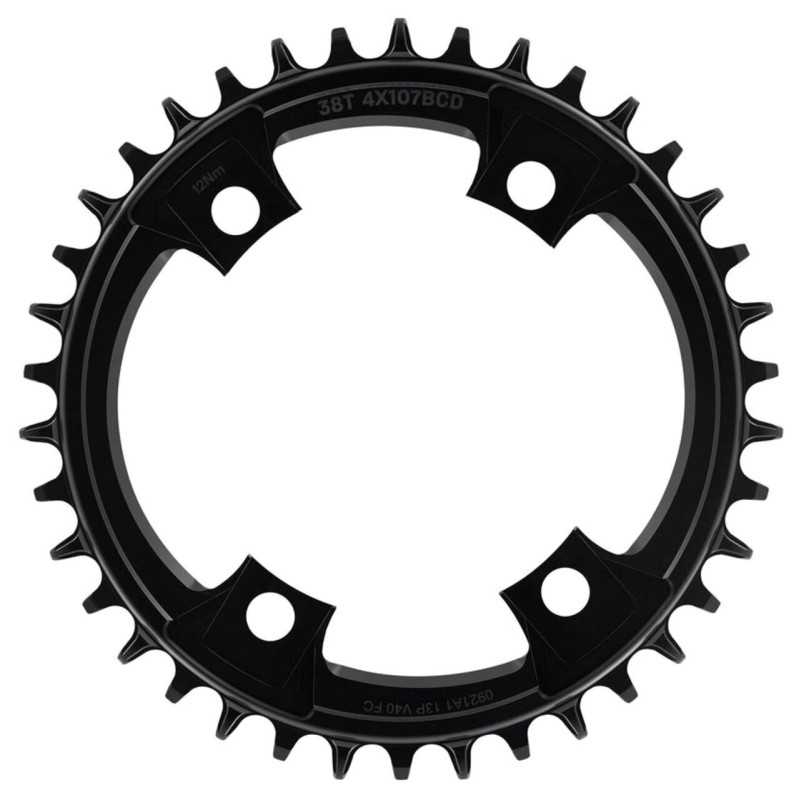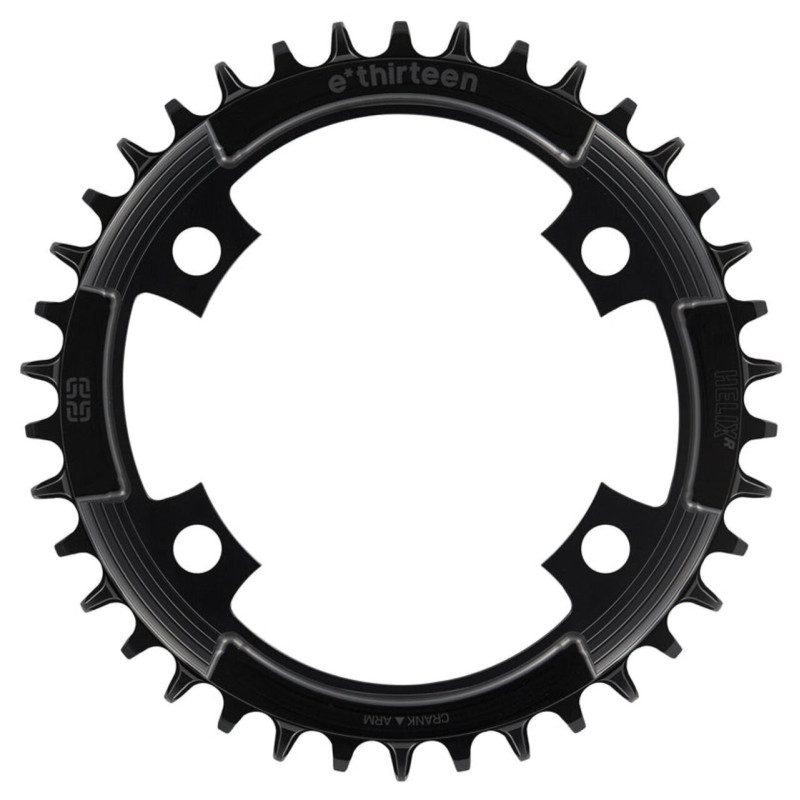 Звезда E*Thirteen Helix R изготовлена из лёгкого и прочного алюминиевого сплава марки 7075-T7, прошедшего штамповку и обработку CNC для достижения оптимальной жёсткости при минимальном весе. Звезда E*Thirteen Helix R рассчитана на крепление 4-болтами по стандарту 107BCD, подходит к шатунам SRAM с этим стандартом, а также к шатунов с интегрированным Power Meter (например, Quarq). Количество зубьев — 38, что позволяет развивать высокую скорость на шоссе и гравии, при этом конструкция зубьев narrow-wide надёжно удерживает цепь и снижает вероятность её соскальзывания.