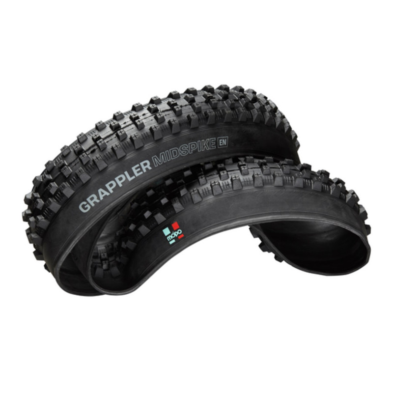Шипы E*Thirteen Grappler Mid Spike имеют специально разработанную гибкую конструкцию с 90 tpi и 1,5 слоями протектора. Они также имеют усиление под протектором и боковые вставки apex для дополнительной прочности. В протекторе используется фирменная резина Mopo от e*thirteen, которая отличается мягкостью, липкостью и медленным отскакиванием. Широко расставленный, угловой и смещенный рисунок протектора помогает быстро очищаться от грязи и обеспечивает надежную поддержку и сцепление на поворотах. Центральные и боковые шипы в форме пирамиды в сочетании с гибким корпусом адаптируются к рельефу местности и обеспечивают максимальное сцепление на поворотах.