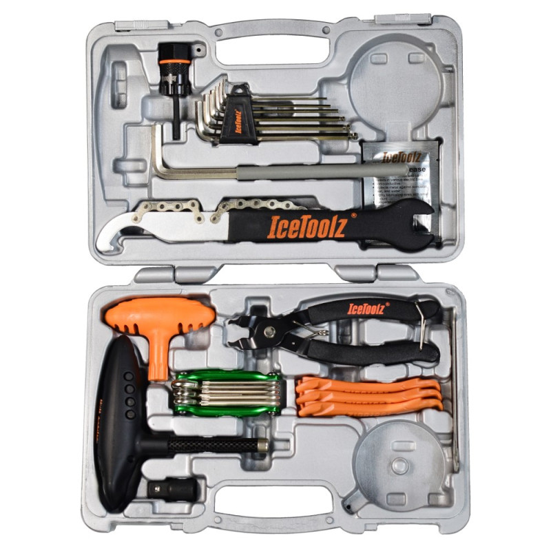 Инструменты изготовлены IceToolz 82F6 из высокопрочной хромомолибденовой стали и размещены в компактном кейсе. Набор охватывает все основные задачи по уходу за трансмиссией и колесами: от проверки износа цепи специальным калибром до работы с кассетами и педалями.