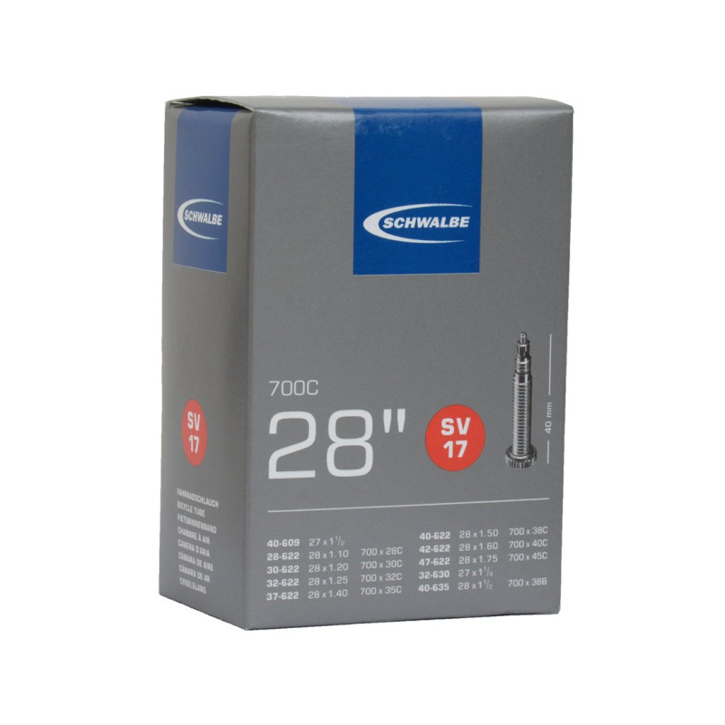 Schwalbe SV17 это популярная камера для колес диаметром 28 дюймов, предназначена для широкого спектра велосипедов: от классических дорожных и городских моделей до современных гравийников и турингов. Благодаря высокому качеству бутиловой смеси, камера Schwalbe SV17 отлично растягивается и подходит для покрышек шириной от 28 до 47 мм, обеспечивая стабильное удержание давления в течение длительного времени.