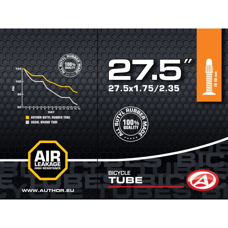 Велосипедная камера Author разработанная специально для горных велосипедов с диаметром колес 27.5 дюймов и шириной покрышек от 1.75 до 2.35 дюйма. Изготовлена из прочного и эластичного бутила, обладает оптимальным балансом между весом и прочностью. Камера Author оснащена автомобильным ниппелем Presta длиной 40 мм, который позволяет накачивать колесо любым автомобильным насосом или компрессором на станциях технического обслуживания или автозаправках.